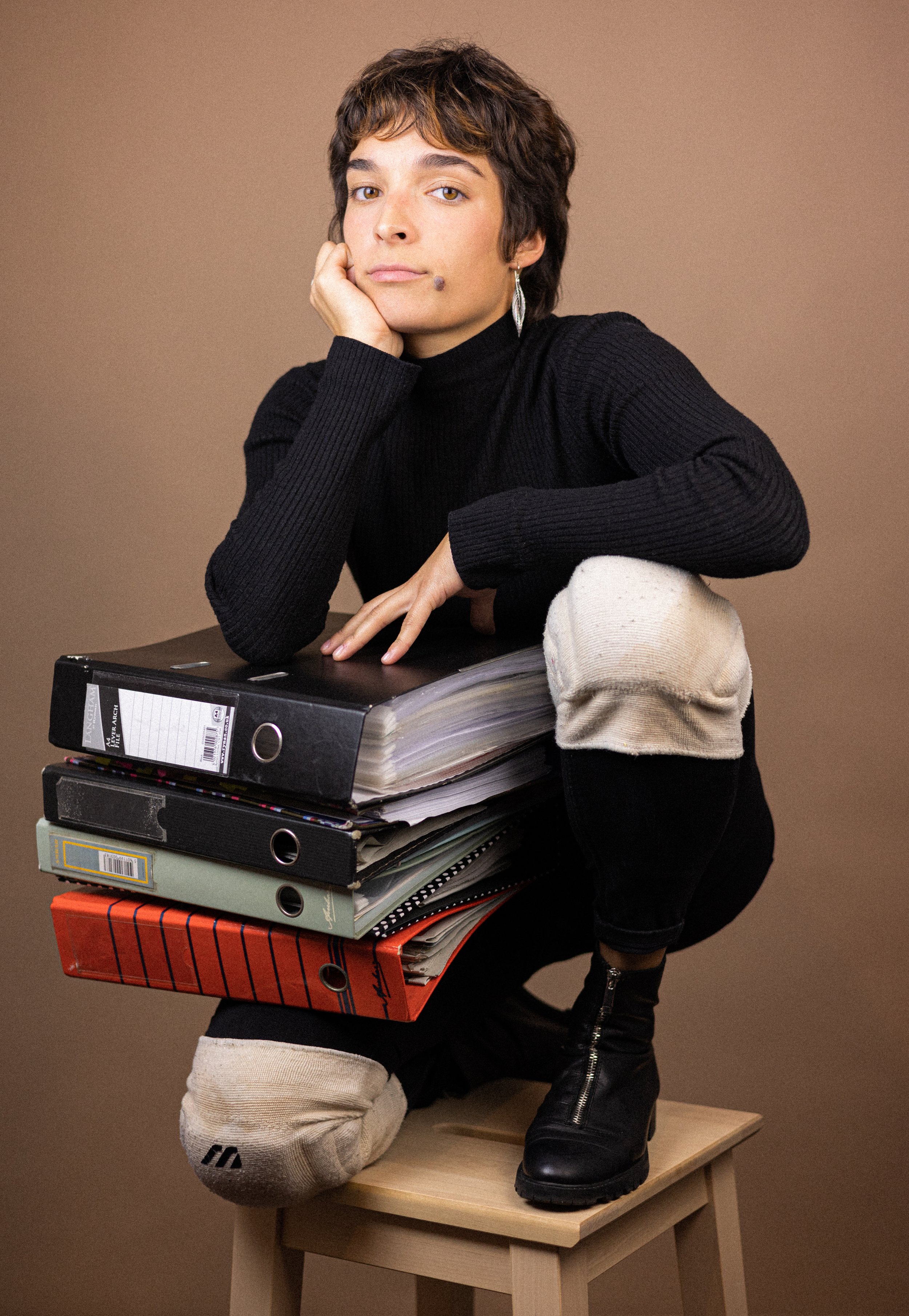 As joelheiras (brancas sobre calças pretas, para contraste) ilustram esta expressão e os dossiers - vários, de diferentes tamanhos, todos eles cheios - a quantidade de trabalho e a multiplicidade de tarefas que recai sobre as trabalhadoras, independentemente do tempo disponível para a sua execução.
